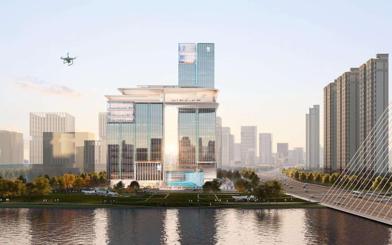該項目位于浙江省杭州市上城區,總建筑面積約7.1萬平方米。地塊定位為義烏中國小商品城集團功能性總部基地,設立Yiwupay全球總部、Chinagoods技術研發中心、浙江智庫、四星級商務酒店等功能。項目以“義杭共振·織網鏈城”為核心設計理念,依托義烏全球小商品產業優勢和杭州數字創新資源,以“總部基因+外商內辦+外展內院”為空間策略,形成“技術研發-產業轉化-全球布局”的閉環式數字經濟生態體系。項目塑造了“枕河望江·數智云窗”的建筑形態,通過空中連廊、共享邊庭、云端會客廳等設計,實現建筑與自然景觀的無界融合,成為杭州錢江新城二期濱水金融總部標桿,打造都市活力新地標,項目建成后將為錢江新城二期產城融合升級注入新動能。