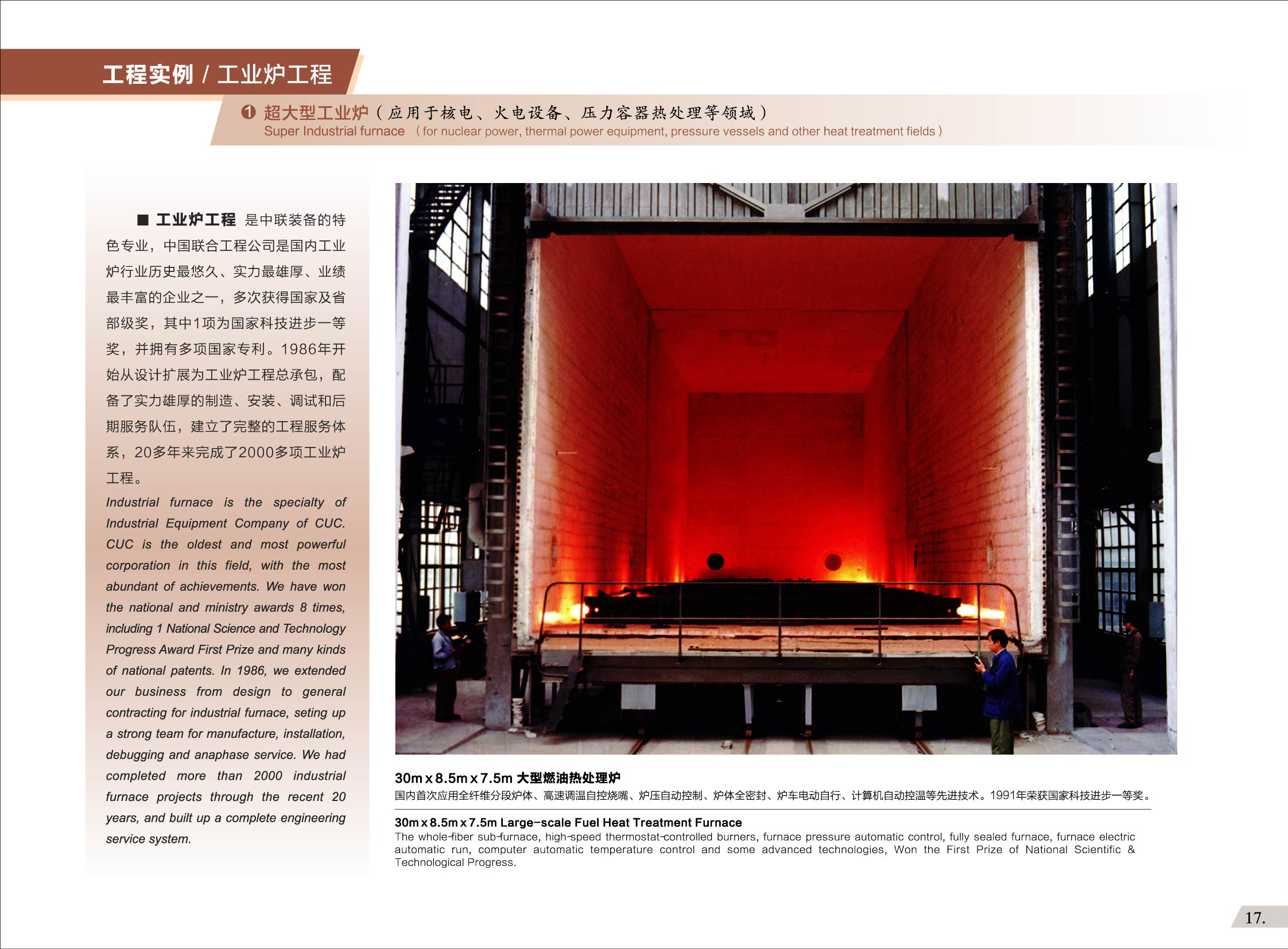中國聯合所屬裝備工程公司,專門從事工業特種裝備及生產線的設計開發、制造、安裝調試和服務等業務,前身是機械工業部第二設計研究院的非標設備所、工業爐所、涂裝所、鑄造所、環保所、自動化所等部門,已有六十多年發展歷史,完成了5000多臺(套)設備工程,在各類工業爐及熱處理生產線,各類涂裝、表面處理設備及生產線,各類專用設備及工業裝配生產線方面業績顯著,工程經驗豐富、社會信譽突出,為我國民族裝備工程發展做出了自己的貢獻。